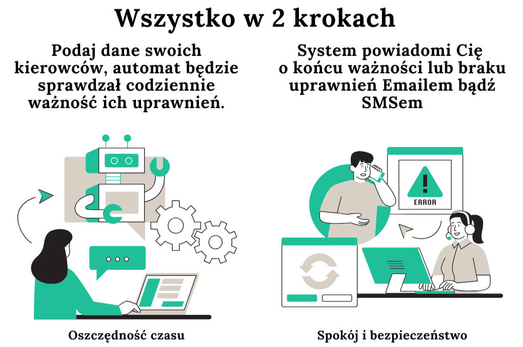 Zarządzasz większą ilością kierowców i nie jesteś w stanie sprawdzać czy ich uprawnienia są nadal aktualne, albo co gorsza czy nie zostały odebrane?Tworzymy system, do którego tylko raz wprowadzisz swoich kierowców, a my będziemy codziennie sprawdzać ich uprawnienia przekazując Ci alerty bezpośrednio na Twój telefon lub email.Nigdy więcej jazdy bez uprawnień w Twojej firmie!